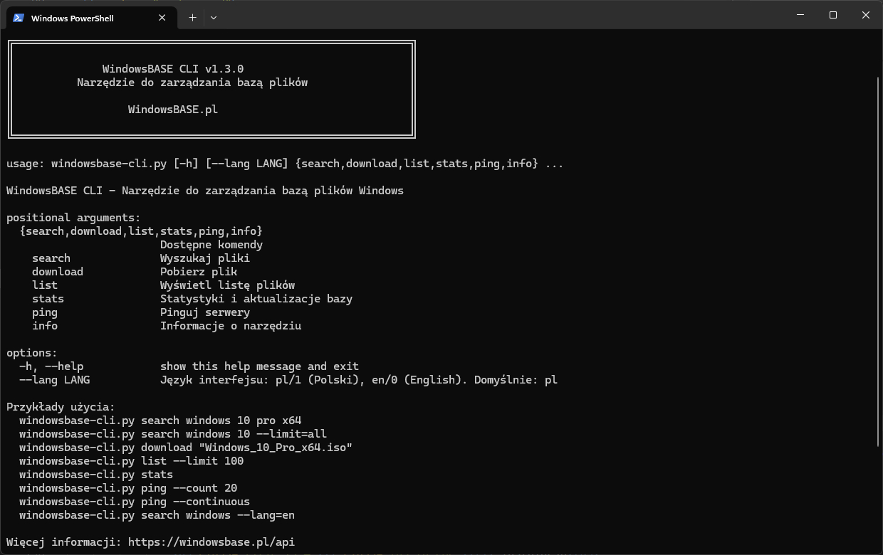 Pełnofunkcjonalne narzędzie wiersza poleceń do zarządzania bazą plików WindowsBASE.pl. Za jego pomocą możesz wyszukiwać, pobierać i zarządzać plikami z poziomu terminala - bez konieczności korzystania z interfejsu webowego. Poniżej zamieszczamy krótką instrukcję instalacji oraz pełną dokumentację użytkowania.